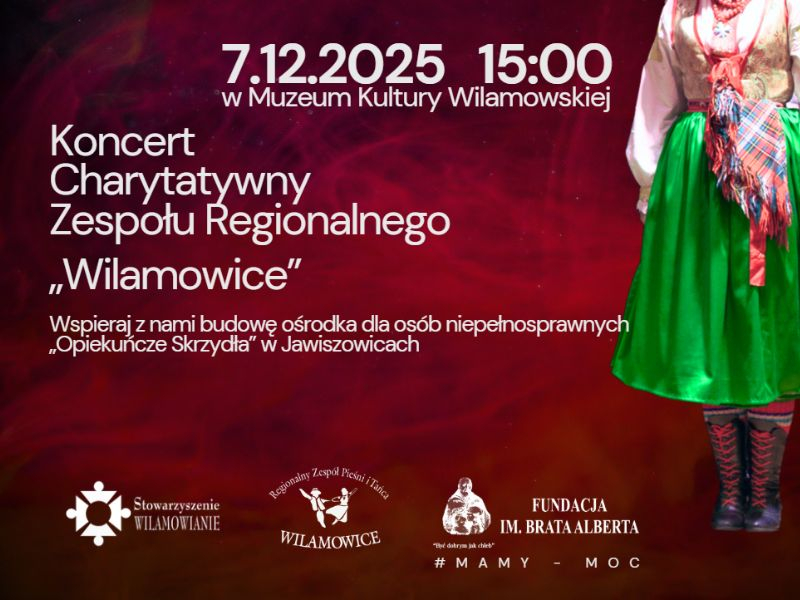 Serdecznie zapraszamy do udziału w Koncercie Charytatywnym Zespołu Regionalnego „Wilamowice”, podczas którego zbierane będą fundusze na budowę ośrodka dla osób niepełnosprawnych „Opiekuńcze Skrzydła” w Jawiszowicach.