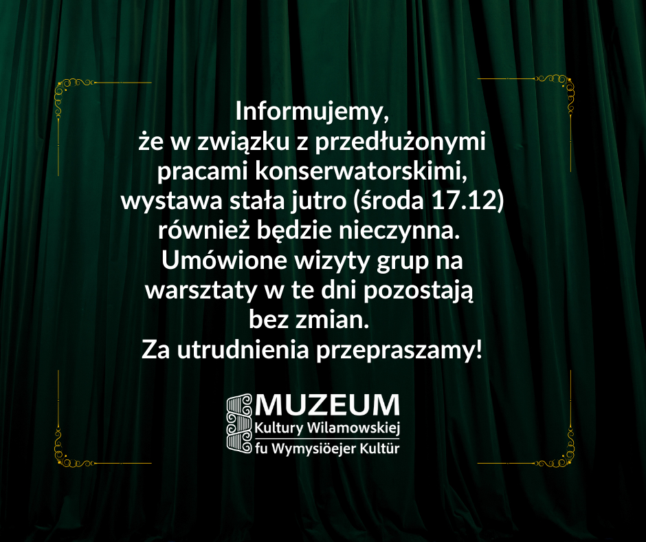 serdecznie przepraszamy za wszelkie niedogodności. Informujemy, że prace konserwatorskie, które miały się odbywać w dniach 15–16 grudnia, nie zostały jeszcze zakończone. W związku z tym wystawa będzie nieczynna również jutro, w środę 17 grudnia.